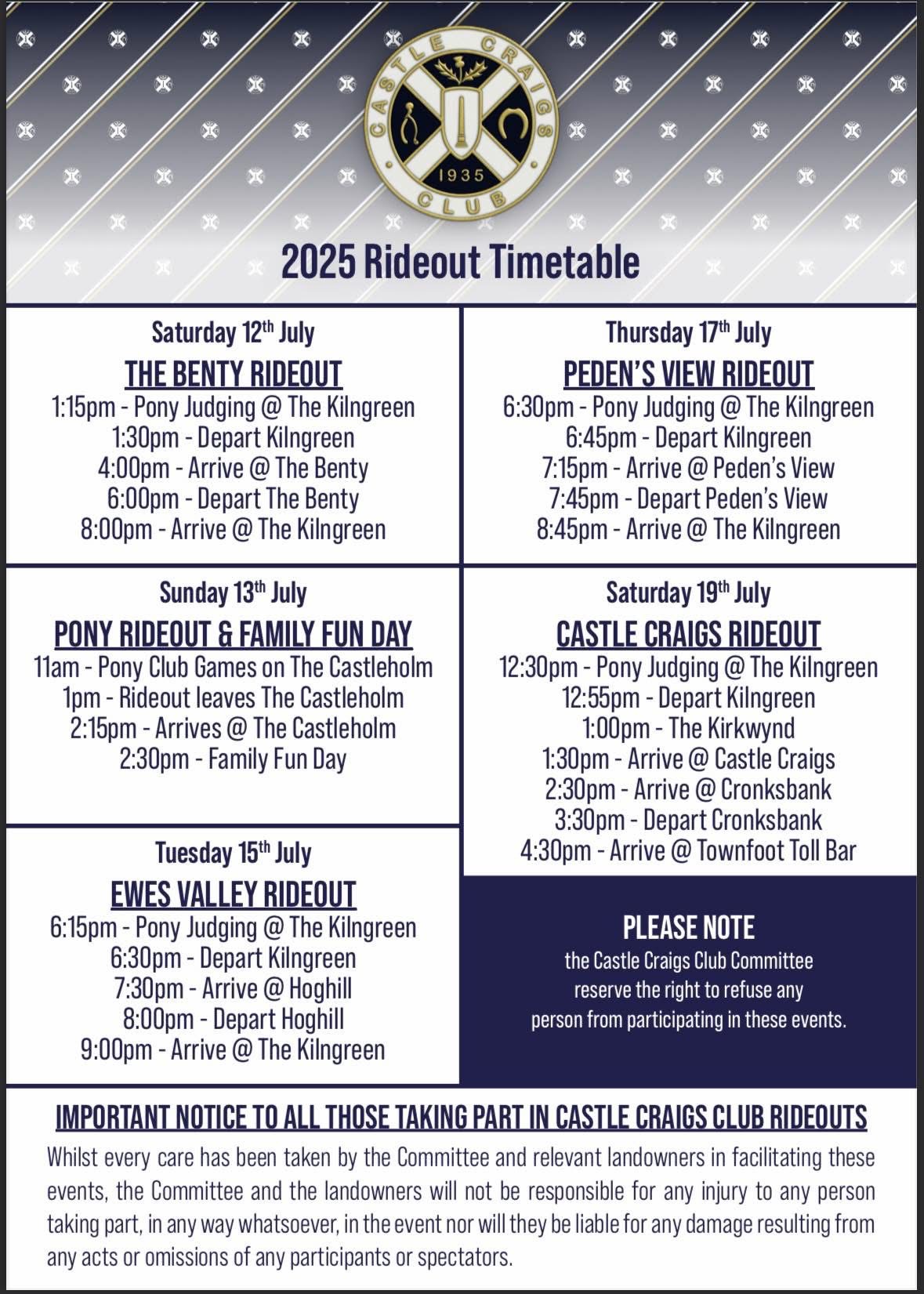 The first Castle Craigs Club Race was won by Mr Drew Stevenson on ‘Brown Sugar’. Since then, as well as organising all pre-Common Riding Rideouts, the club has dedicated itself to fostering the Common Riding spirit and ‘supporting all appertaining to the Common Riding ceremonial’.